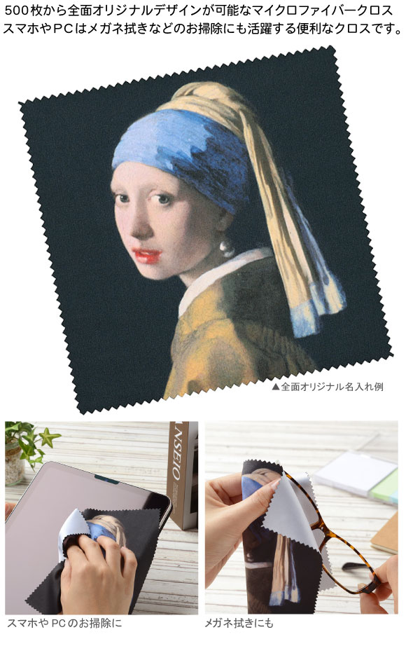 オリジナル マイクロファイバークロス 名入れ代込みは500枚から全面オリジナルデザインが可能なマルチクリナーです。スマホやPCのお掃除はもちろんメガネ拭き家庭用品などのお掃除に細かなホコリ汚れも、きれいに拭き取れるお役立ちマイクロファイバークロスです。スマホなどのノベルティ、販促品として本体にロゴなどの名入れをすればより一層宣伝効果があります。