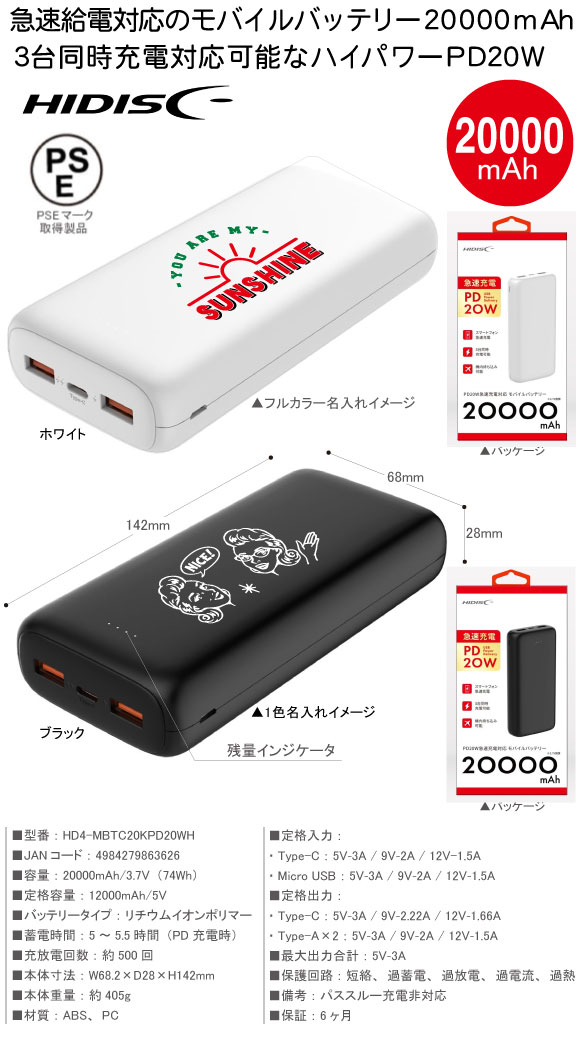 モバイルバッテリー急速PD20W 20000mAhは1色~4色まで大きく入る名入れはインクジェット+UV硬化インク(紫外線)で、硬化・定着するインクを使用のため出力・印刷時には乾燥しているため名入れの場合、納期の大幅な短縮を実現しました。大容量20000mAh。外出時や旅行中でも、かさばることなくスマートフォンやタブレットなどのデバイスを充電できます。「外出中にスマホの電池がすぐ減る」「複数デバイスを一度に充電したい」そんな声に応えるのが、HIDISC PD20W急速充電対応 モバイルバッテリー 20000mAh 。PD20W対応のType-Cポートを搭載し、スマートフォンやタブレットをスピーディーに充電可能。急いでいる時も短時間でパワーを回復できます。さらに、Type-Aポートを2つ備え、最大3台同時に充電できるので、ビジネスや旅行でも大活躍。20000mAhの大容量で、スマホなら約4回分のフル充電が可能。1日中外出しても安心です。電気用品安全法技術基準PSEに適合したPSE認定品です。名入れ範囲も広いのでアピール度抜群です。記念品としてもちろんノベルティ、販促品用に企業やお店のロゴやマークなどの名入れをすれば オリジナル商品としてより一層宣伝効果があります。