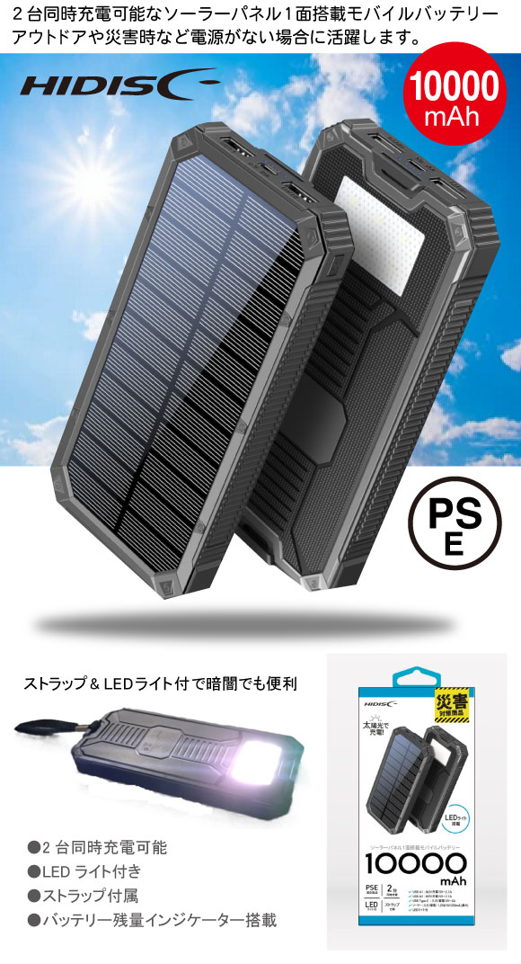 ソーラーパネル1面搭載モバイルバッテリー10000mAh