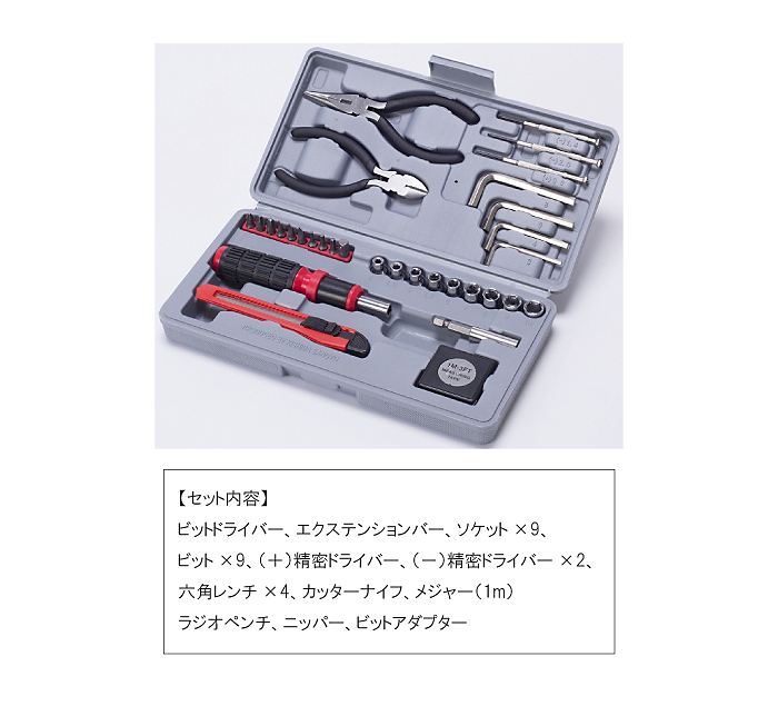 - 備考:セット内容/ビットドライバー、エクステンションバー、ソケット×9、ビット×9、(+)精密ドライバー、(-)精密ドライバー×2、六角レンチ×4、カッターナイフ、メジャー(1m)、ラジオペンチ、ニッパー、ビットアダプター