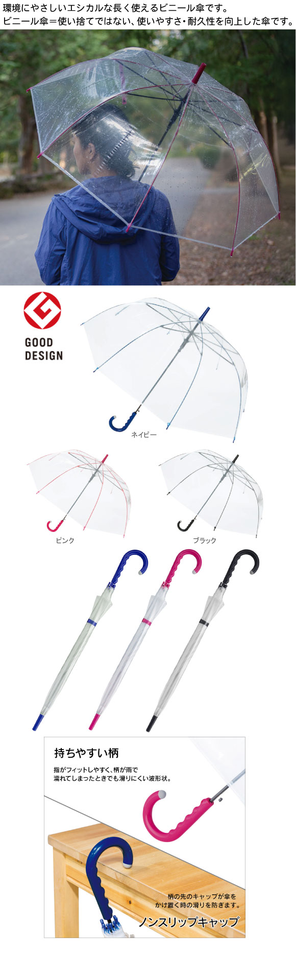 カラフルアンブレラは環境にやさしいエシカルな長く使えるビニール傘です。ビニール傘=使い捨てではない、使いやすさ・耐久性を向上させた傘です。持ちやすい柄、ノンスリップキャップ採用で使いやすさも抜群です!