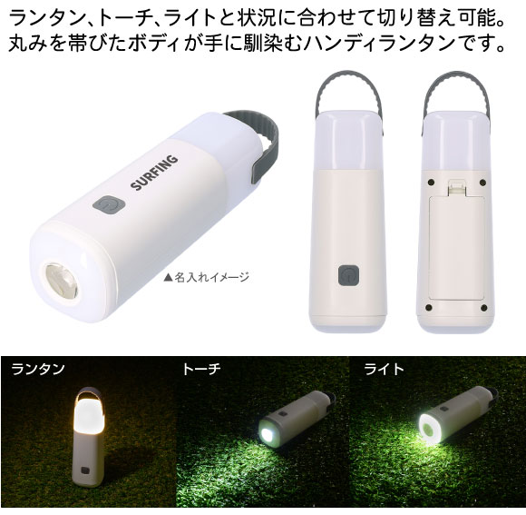 ハンディランタンはランタン、トーチ、ライトと状況に合わせて切り替え可能。状況に合わせて3色の光を切り替えられる、丸みを帯びたボディが手に馴染むハンディランタン。ノベルティ、販促品として本体にロゴなどの名入れをすればより一層宣伝効果があります。