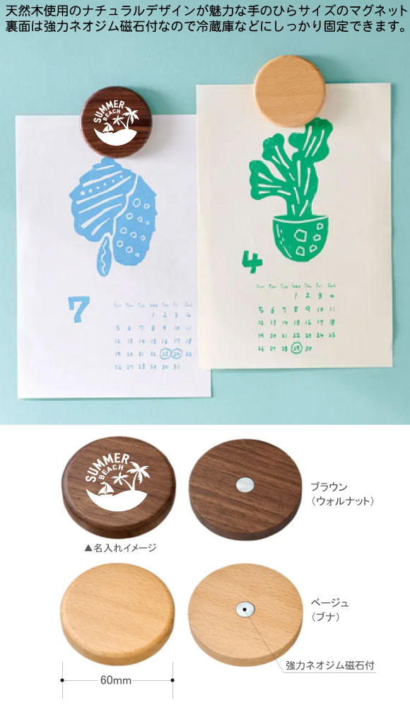 ウッド丸型マグネットは天然木使用のナチュラルデザインが魅力な手のひらサイズのマグネット。ウォルナット使用のブラウンと、ブナを使用したベージュの2色をご用意しています。見た目はやわらかく・かわいらしい印象ながら、裏面に強力マグネットを備えているのでホワイトボードや冷蔵庫などにしっかり固定できます。家庭やオフィスでも使用できる場面が幅広く、ノベルティとして名入れのPR効果が高いアイテムです。