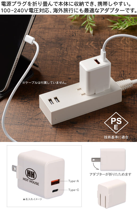 2ポートアダプター 20Wは電源プラグを折り畳んで本体に収納でき、携帯しやすい。100V-240V電圧対応、海外旅行にも最適です。ノベルティ、販促品用に本体に企業やお店のロゴやマークなどの名入れをすれば より一層宣伝効果があります。
