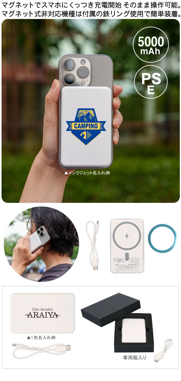 マグネット付ワイヤレスバッテリー5000はマグネットでスマホにくっつき充電開始。マグネット式非対応機種は付属の鉄リング使用。※スマートフォンが無線充電に対応している必要があります。ノベルティ、販促品として本体にロゴなどの名入れをすればより一層宣伝効果があります。