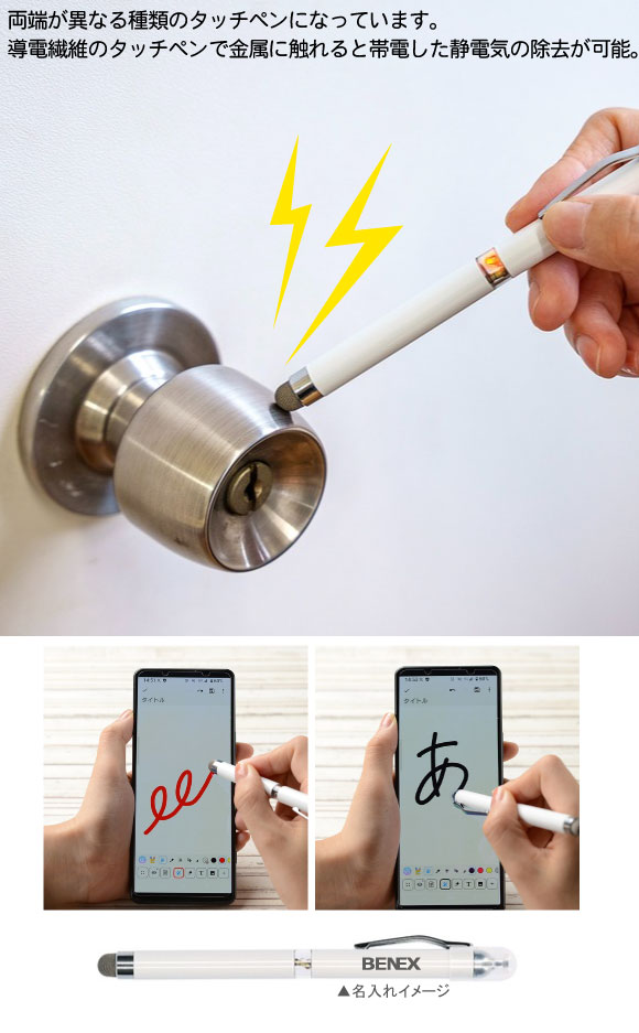 静電気さっとりタッチペンは両端が異なる種類のタッチペンになっています。導電繊維のタッチペンで金属に触れると帯電した静電気の除去ができます。ノベルティ、販促品として本体にロゴなどの名入れをすればより一層宣伝効果があります。