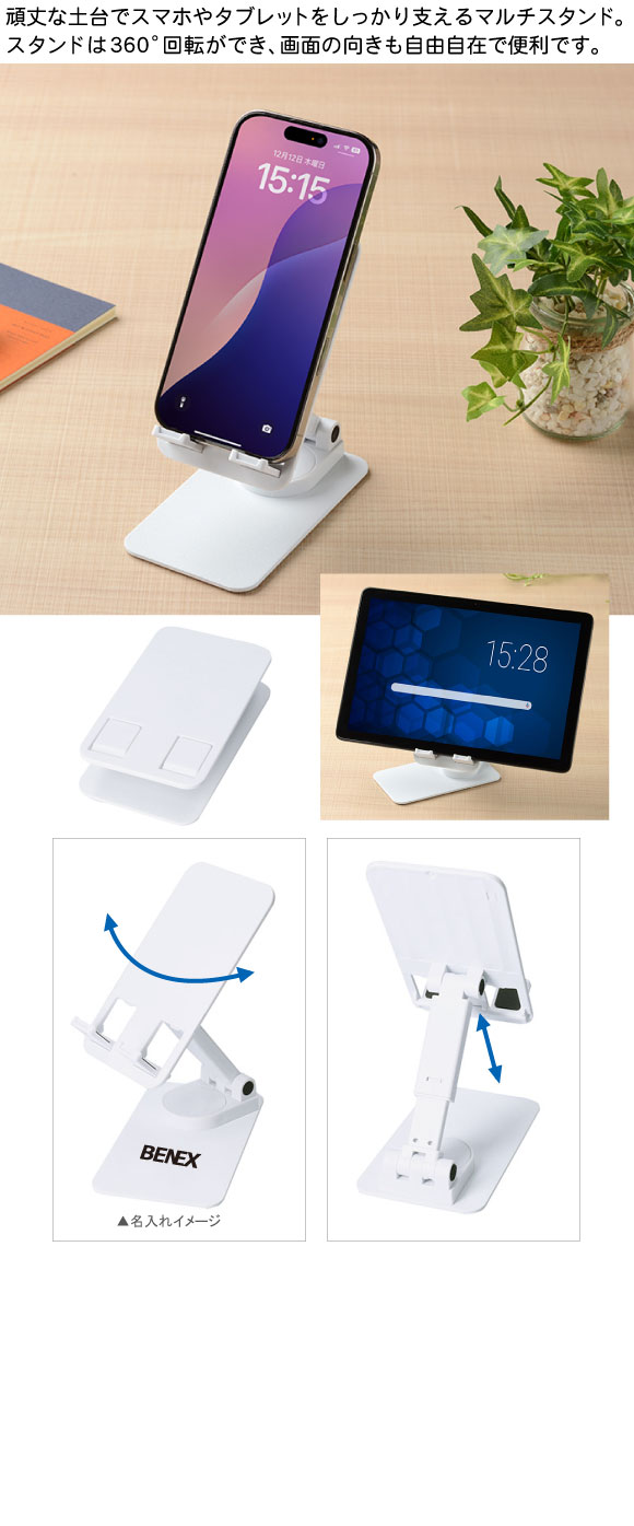 マルチモバイルスタンドは頑丈な土台でスマホやタブレットを強力に支えるマルチスタンド。360°回転式で、画面の向きも自由自在です。バッグの隙間に収まるコンパクト設計。折りたたんでコンパクトに持ち運べるため、外出先やオフィスでも便利。動画視聴やオンライン会議、デスクワークの利便性を劇的に向上させます。 ノベルティ、販促品として本体にロゴなどの名入れをすればより一層宣伝効果があります。