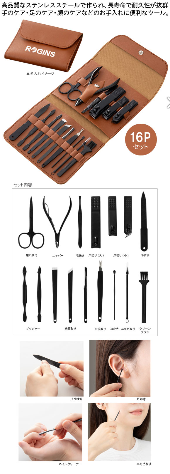 - 備考:セット内容:爪切り×3、ネイルニッパー、毛抜き、眉ハサミ、甘皮取り、やすり、にきび取り、耳かき、プッシャー×2、クリーニングブラシ、角質ナイフ×3