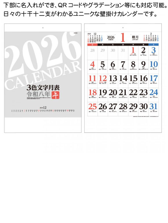 壁掛け 3色文字月表 十干十二支はお客様からの壁掛けカレンダーにフルカラー名入れ希望という問い合わせが多くございましたので、この度 3色文字月表 十干十二支をご用意しました。1色~フルカラーまでグラデーションや写真、QRコードの印刷も可能です。見やすいシンプルデザインが好評なセブンデイズセブンカラーズの壁掛けで大きな名入れサイズで遠くからでもはっきり見えます。