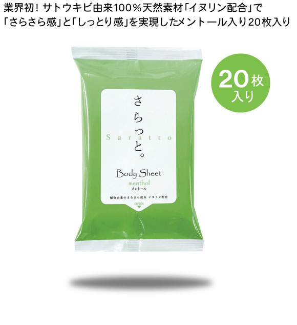 汗ふきシート「さらっと。」メントール入り 20枚(日本製)は業界初!サトウキビ由来の100%天然素材「イヌリン配合」で「さらさら感」と「しっとり感」を実現したメントール入りの20枚入り除菌ウェットティッシュです。厚手のシートで使いやすさUPしました。安価で安心・安全な国産品のウェットティッシュは販促品・ノベルティに最適なメントール配合の汗拭きシートです。