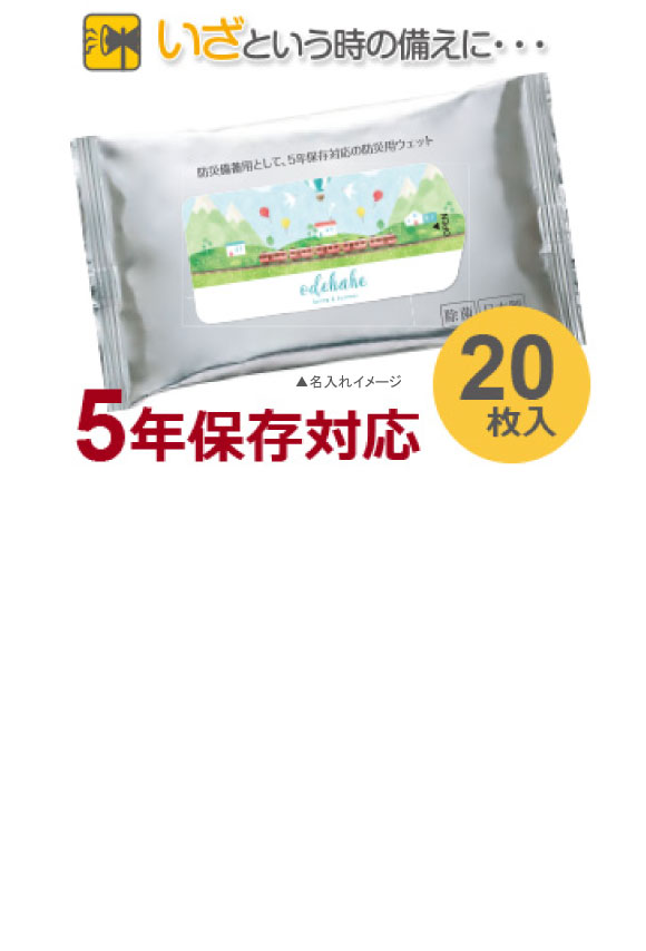 7days,防災除菌ウェット大判20枚入(5年保管対応)日本製 フルカラー名入れ代込みはいざという時の備えに!5年間保管可能な大判ウェットティッシュです。パラベンフリー・アルコール配合。販売促進としてノベルティ、販促品用にロゴやマークなどフラップにフルカラー名入れをし 配布すれば企業やお店のイメージアップや売り上げにつながります。7days,防災除菌ウェット大判20枚入は大判ウェットで一年中使用可能なので防災グッズとして保管して置けばいざという時に重宝します。