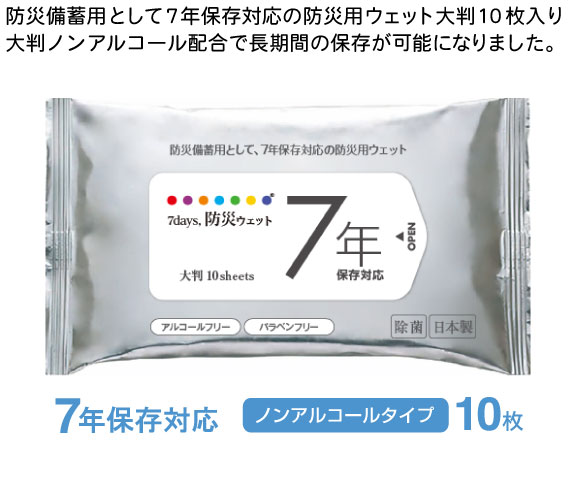 7days,防災ウェット 7年保存対応 アルコールフリー 大判10枚 日本製はいざという時の備えに!7年間保管可能なパラベンフリー・ノンアルコール配合の大判ウェットティッシュです。販売促進としてノベルティ、販促品用にロゴやマークなどフラップに名入れをし 配布すれば企業やお店のイメージアップや売り上げにつながります。