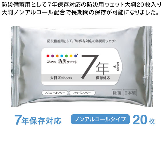 7days,防災ウェット 7年保存対応 アルコールフリー 大判20枚 日本製はいざという時の備えに!7年間保管可能なパラベンフリー・ノンアルコール配合の大判ウェットティッシュです。たっぷり使える20枚入れなのでいろいろな場所にご使用できます。販売促進としてノベルティ、販促品用にロゴやマークなどフラップに名入れをし 配布すれば企業やお店のイメージアップや売り上げにつながります。