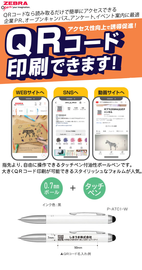 ゼブラ スタイラスC1 タッチペン QRコード印刷専用はタッチペンにQRコードの名入れが可能。スマートフォンの操作に便利なタッチペンにボールペンが付いたゼブラ スタイラスC1。静電容量方式用ツイスト式油性ボールペン付タッチペン0.7mmです。クリップ側の操作でスマートホンの小さなアイコンもスイスイタッチできます。 スマートフォン・タブレットなどの専用タッチペンです。ボールペンの替芯交換も可能です。