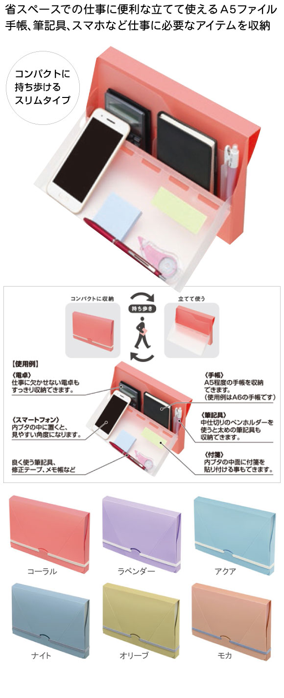 パイロット 持ち歩きワークファイルA5スリムは手帳、筆記具、電卓、スマートフォン等、仕事に最低限必要なアイテムを持ち歩き、ワークスペースにそのまま置いて使えるファイルケースです。収納時は持ち運びに便利な箱型のファイルが、蓋を開いて立てて使える卓上スタンドケースに変形、省スペースでの仕事に活用できます。