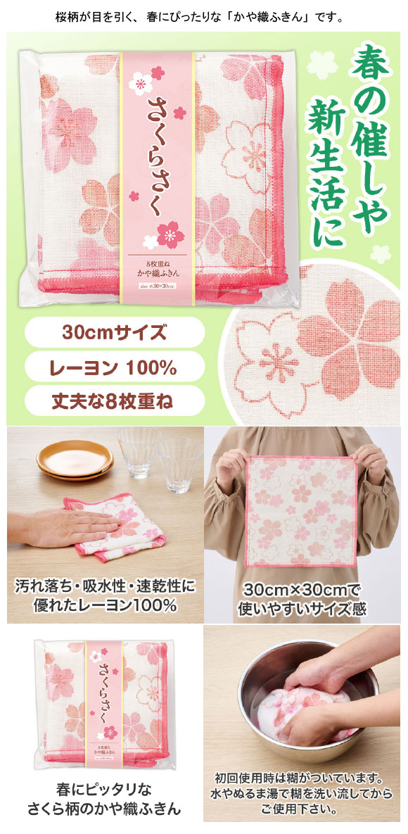 さくらさく かや織ふきんは桜柄が目を引く、春にぴったりな「かや織ふきん」です。パッケージには「さくらさく」のメッセージと鮮やかな桜が描かれており、受け取った方の心がほっと和みます。ふきんは汚れ落ち・吸水性・速乾性に優れたレーヨン100%素材。30×30cmの使いやすいサイズ感で、贅沢な8層仕立てのため丈夫で長持ちします。使い始めはぬるま湯でよく洗い、糊を落としてからご使用ください。使うほどにやわらかくなり吸水性も高まっていきます。毎日の家事でしっかり活躍し、長く使えるため、販促物としての印象が残りやすい点もメリット。粗品・ノベルティとしてはもちろん、外国人観光客を対象としたインバウンド向けアイテムとしてもおすすめです。