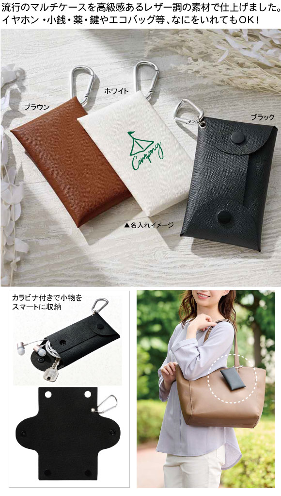 カラモ レザー調マルチケースは軽量で持ち運びやすく上品なレザー調のデザインが魅力のマルチケースです。イヤフォン・小銭・薬・鍵やエコバッグ等、なにをいれてもOKです。カラビナ付きでバッグやベルトループに簡単に取り付けられます。さらに、ボタンを外せばフルオープンの状態になり、中身の取り出しもお掃除も簡単です。