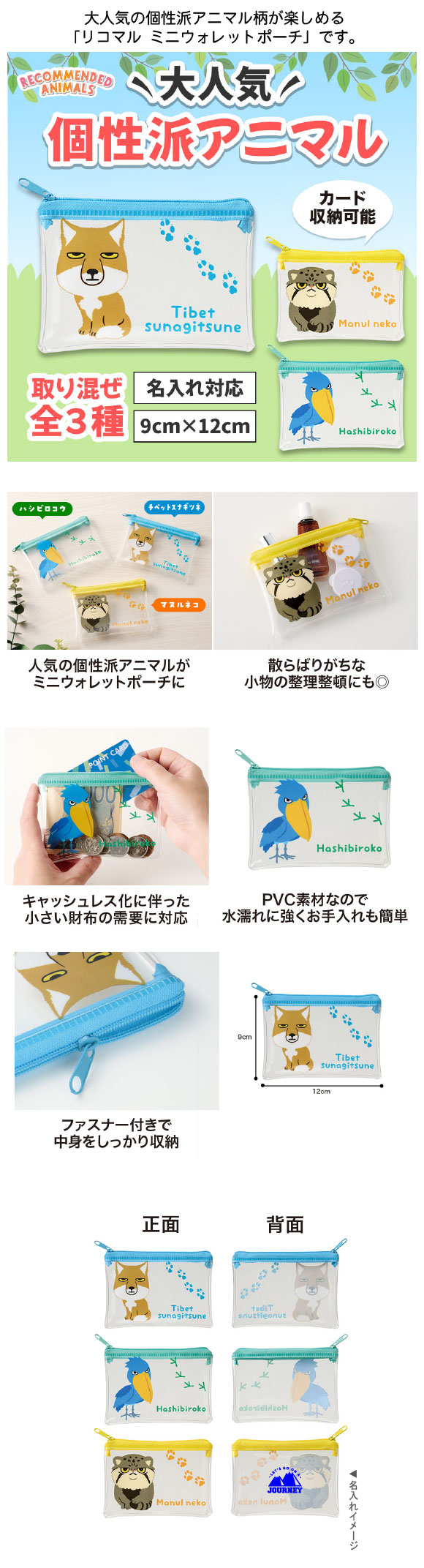リコマル ミニウォレットポーチは大人気の個性派アニマル柄が楽しめる「リコマル ミニウォレットポーチ」です。ハシビロコウ・マヌルネコ・チベットスナギツネの3種類をデザインした、ユニークでインパクトのあるシリーズ。動物好きな方やファミリー層に特に喜ばれるアイテムです。サイズはコンパクトな約9×12cm。小銭やカードを入れてお財布代わりに使えるほか、コスメやお菓子、ケーブル等の小物ポーチとしても便利。PVC素材なので軽く、中身が見えて使いやすいのもポイントです。キャッシュレス化が進む中、最低限のお金やカードを持ち歩きたい方にもぴったり。シンプルに持ち運べる便利さが魅力です。名入れ印刷にも対応しており、長3封筒に入るサイズのため、DMに同封して配布することも可能です。かわいさと実用性を兼ね備えており、動物関連のイベントやノベルティにおすすめです。