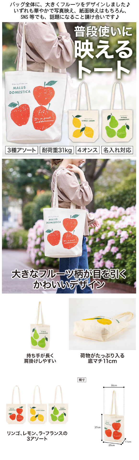 フィンゴ マチありコットンバッグはバッグ全体に、大きくフルーツをデザインしました♪リンゴ/レモン/ラ・フランスの3種取り混ぜとなります。いずれも華やかで写真映え、紙面映えはもちろん、SNS等でも、話題になること請け合いです♪肌触りの良いコットン素材、4オンスの程よい厚さで使い勝手◎底マチは11cmで見た目以上の容量!たっぷり収納可能です。持ち手が長く肩掛けもしやすい仕様ですので、荷物で重くなってしまっても安心です。通勤・通学時のサブバッグ、日々のお買い物・お散歩等、日常使いにぴったり♪名入れにも対応しておりますので、 御社・貴団体の名称・ロゴ等を印刷すれば、PR効果抜群のオリジナルコットンバッグが簡単に実現します!フルーツ類のお取り扱いがある店舗・スーパー・道の駅、そして飲食業界や食育関連イベント等で、是非ご活用ください。