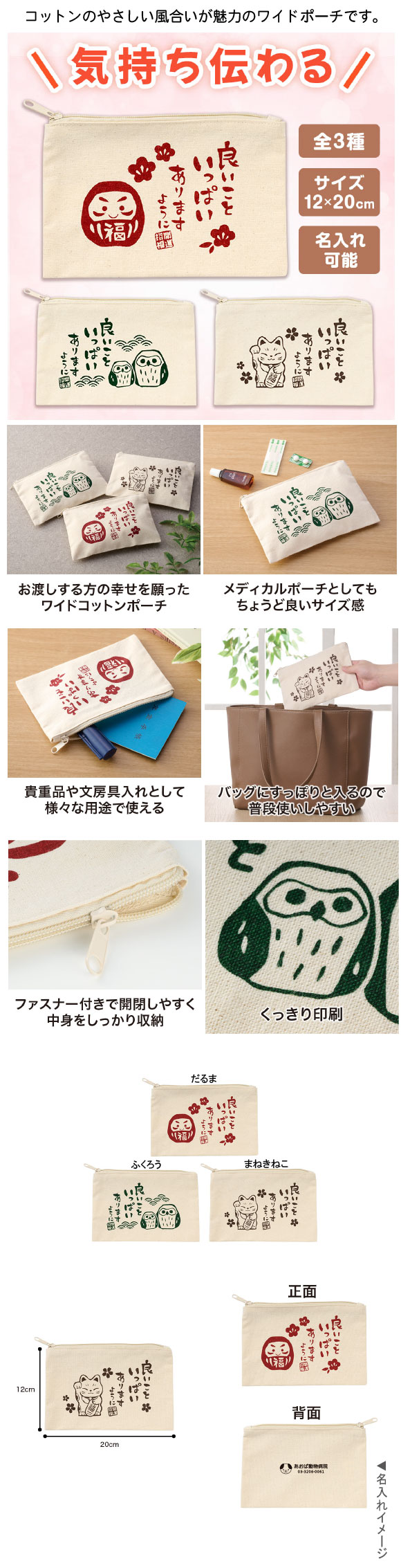 良いこといっぱいありますように コットンワイドポーチはコットンのやさしい風合いが魅力のワイドポーチです。だるま・まねきねこ・ふくろうの3種アソートで、縁起の良いモチーフとともに「良いこといっぱいありますように」のメッセージをプリント。フラットタイプなのでカバンにすっきり収納可能。8オンスの生地を使用しており、扱いやすい厚みで、気軽に使えます。年金手帳や印鑑、薬等の持ち運びポーチとしても便利。シンプルな1色印刷なので主張しすぎず、普段使いしやすいのもポイントです。名入れ印刷にも対応しており、長3封筒に入るサイズのため、DMに同封して配布することも可能です。敬老会や町内会イベント、介護施設等での贈り物としてもぴったりです。実用性と縁起の良さを兼ね備えており、幅広い世代に喜ばれるノベルティです。