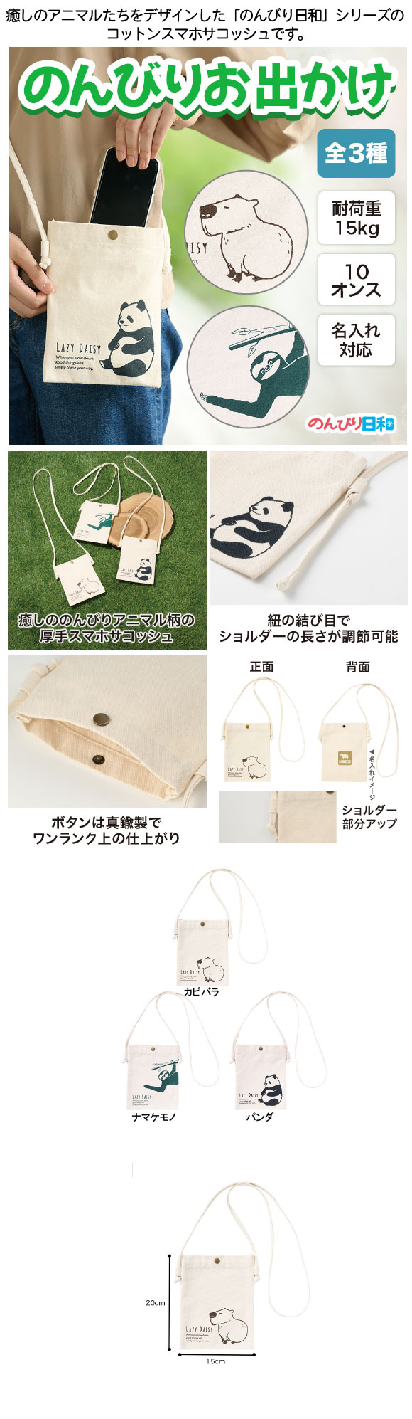 のんびり日和 コットンスマホサコッシュは癒しのアニマルたちをデザインした「のんびり日和」シリーズのコットンスマホサコッシュです。カピバラ・ナマケモノ・パンダの3種アソートで、見ているだけで心が和むデザイン。忙しい毎日に、たまにはのんびりしてほしいという願いを込めたシリーズです。素材はしっかりとした10オンスの厚手コットン。スマホや小物を持ち運ぶのに便利で、スタッフポーチとしても活躍します。ショルダーの長さは調整可能。真鍮ボタンを使用しており、見た目にもワンランク上の仕上がりになっています。裏面には名入れができ、企業名やイベント名を入れて配布すれば長く販促効果が続きます。携帯ショップや商業施設、住宅展示場や通販業界等、幅広い業種でのノベルティにぴったり。かわいさと実用性を兼ね備え、ノベルティやギフトとしても喜ばれるアイテムです。