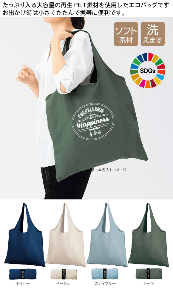 テラッソ 再生PETマルシェエコバッグは再生素材100%の生地を使用の地球にやさしいビッグエコバッグです。ソフト再生PET素材を使用した やわらかく高級感のあるエコバッグシリーズ。使いやすさで一番人気のサイズ!小さくたたんでポケットに入れて持ち運べます。SDGs 対応の社会に貢献する商品としてノベルティ、販促品にお薦めします。