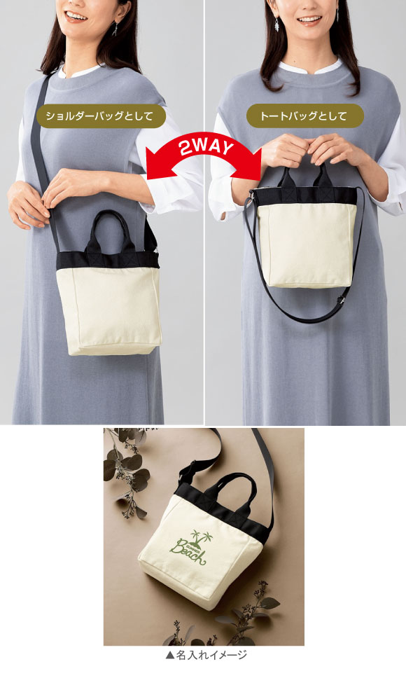 キャンバー ショルダーバッグ は持ち手付きなのでショルダーバッグにも、トートバッグにも使用できる2WAYバッグです。キャンバス風素材のしっかりしたショルダーバッグでちょっとしたお買物に便利です。