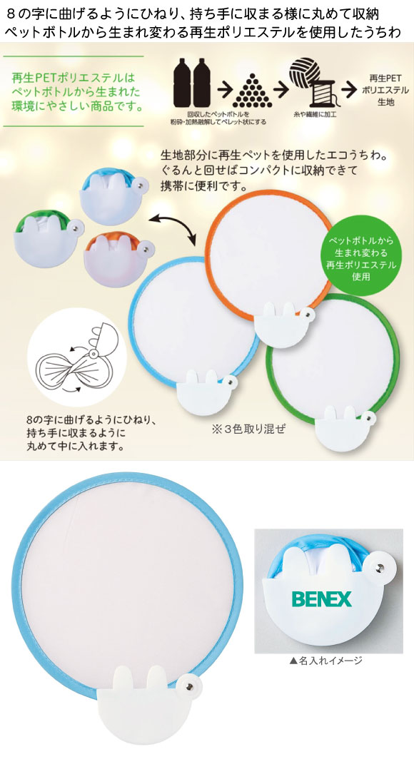 再生PET収納エコうちわ はペットボトルから生まれ変わる再生ポリエステルを使用した収納できるうちわです。