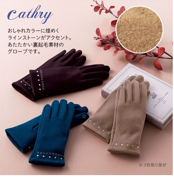 キャスリー裏起毛グローブはおしゃれカラーに煌めくラインストーンがアクセント。あたたかい裏起毛素材のグローブです。