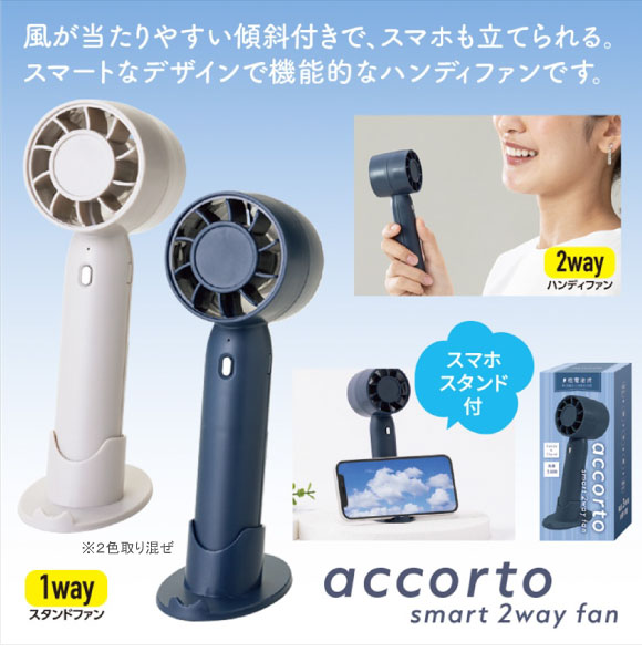 アコルト スマート2wayファン(電池式)は風が当たりやすい傾斜付きで、スマホも立てられる。スマートなデザインで機能的な電池式ハンディファンです。