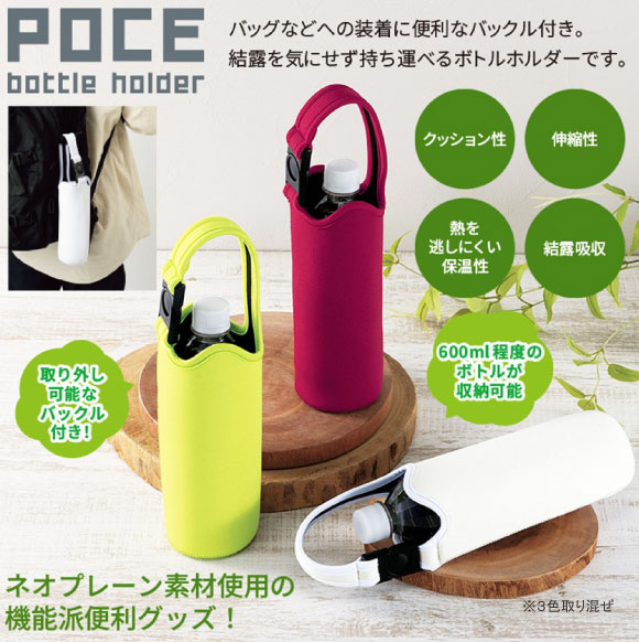 ポス ボトルホルダーはバッグなどの装着に便利な取り外し可能なバックル付き。結露を気にせず持ち運べるボトルホルダーです。600ml程度のボトルが収納可能です。
