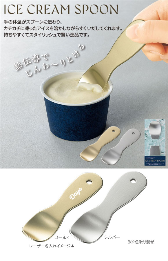 じんわりとけるアイスクリームスプーンは手の体温がスプーンに伝わり、カチカチに凍ったアイスを溶かしながらすくうことができます。持ちやすくてスタイリッシュな逸品です。本体ゴールドとシルバーにレーザー名入れが映えるスプーンです。