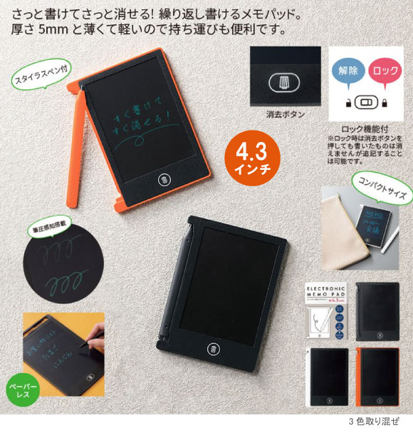 コンパクト電子メモパッド4.3インチはさっと書けてさっと消せる!繰り返し書けるメモパッド。コンパクトサイズで、厚さ5mm と薄くて軽いので持ち運びもより便利です。