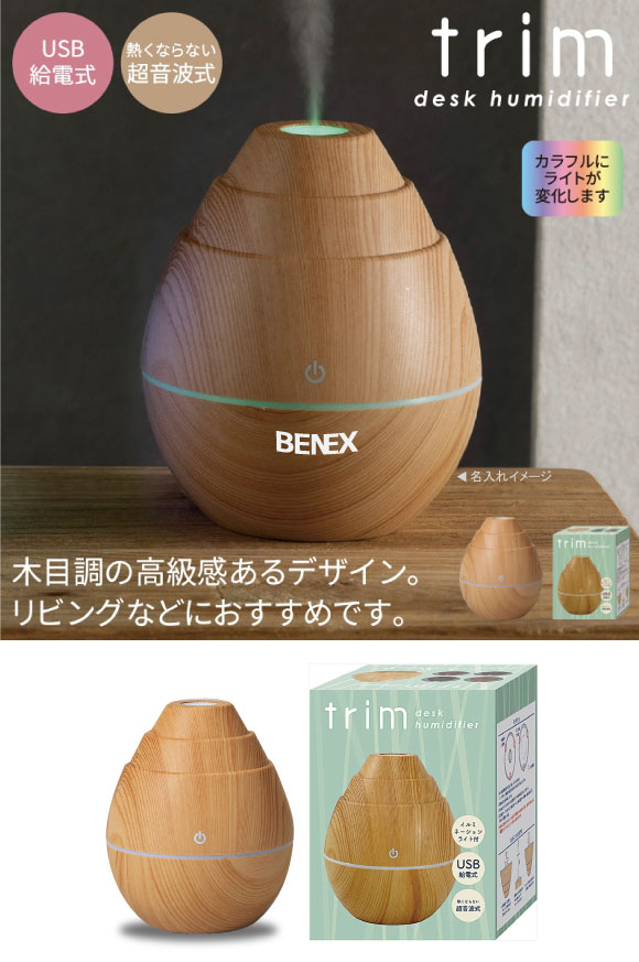 トリム 卓上加湿器は木目調の高級感あるデザインでリビングなどにおすすめです。USB給電方式の熱くならない超音波式。吹き出し口はカラフルにライトが変化するイルミネーションが癒しの空間を演出してくれます。