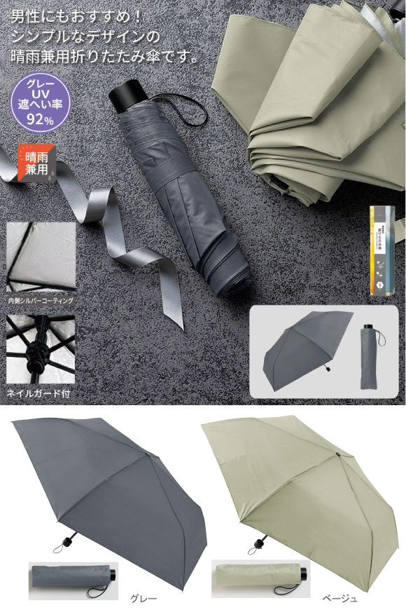 晴雨兼用折りたたみ傘は男性にもおすすめ!シンプルなデザインの晴雨兼用折りたたみ傘です。UV遮へい率はグレー92%、ベージュ95%で内側はシルバーコーティングされています。