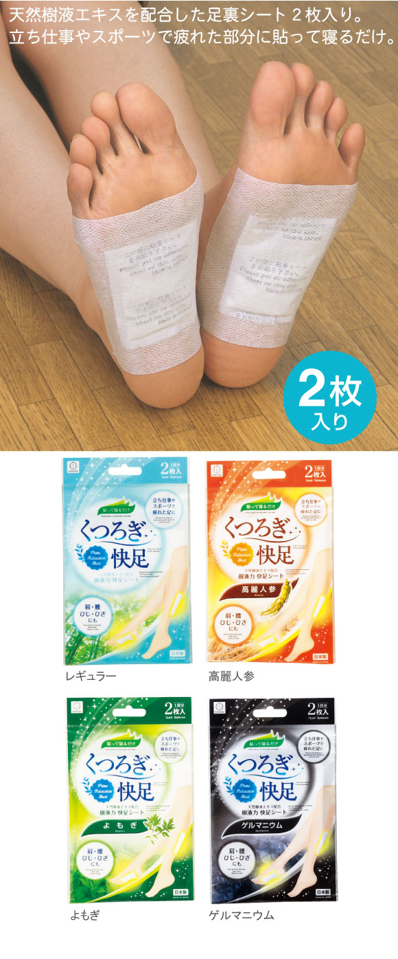 くつろぎ快足 樹液力快足シート(2枚入)は天然樹液エキスを配合し、足の裏に貼って寝るだけで翌朝リフレッシュするシートです。お好みの種類で、疲れた足を寝ている間に癒せます。立ち仕事やスポーツで疲れた足・肩・ひじなどに貼って寝るだけで翌朝はすっきりリラックス。