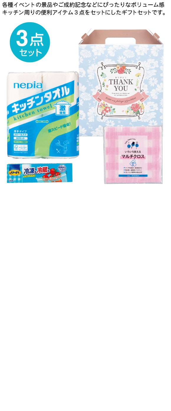 頼れるキッチン3点セットは各種イベントの景品やご成約記念などにぴったりなもらってうれしいボリューム感満載のキッチン周りの便利アイテム3点をセットにしたギフトセットです。