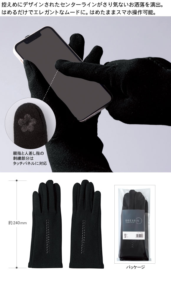 ドレッシア スマホタッチグローブは控えめにデザインされたセンターラインがさり気ないお洒落を演出します。はめるだけでエレガントなムードに。