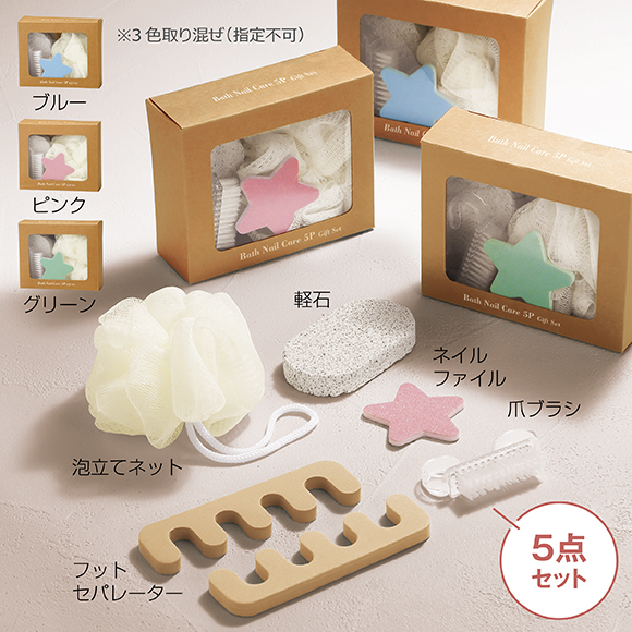 - 備考:セット内容(各1個):泡立てネット:約φ95mm、フットセパレータ―:108×30×8mm、ネイルファイル:48×50×3mm、爪ブラシ:63×33×14mm、軽石:80×45×13mm