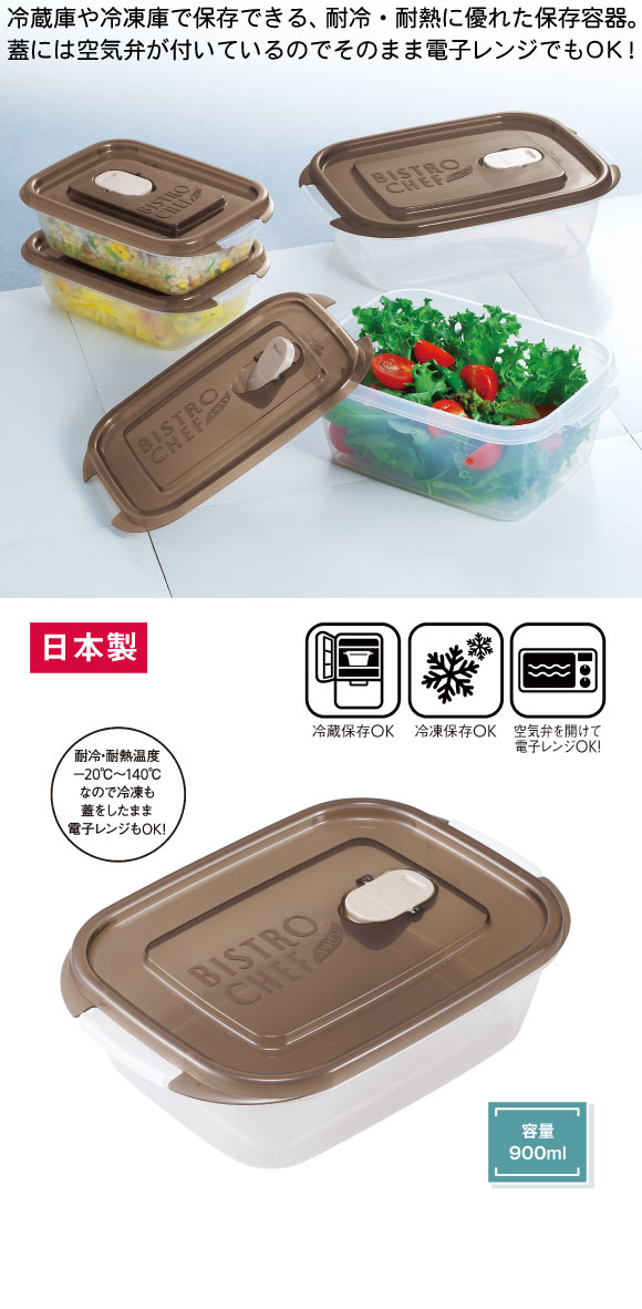 ビストロシェフ・空気弁付き保存容器は作り置きや食べきれず残ってしまったおかずなどを冷蔵庫や冷凍庫で保存できる、耐冷・耐熱に優れた保存容器。蓋には空気弁が付いているのでそのまま電子レンジで温めもOK!
