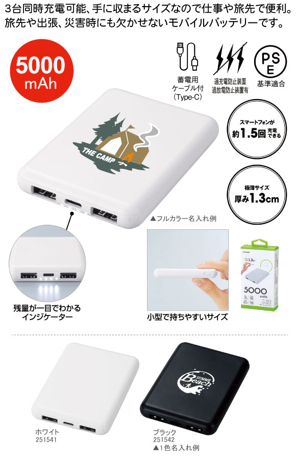 モバイルバッテリー5000mAhは薄型、軽量で3台同時に充電が可能!急速充電・小型軽量コンパクトモバイルバッテリー5000mAhです。厚み わずか1.3cmの極薄のコンパクトボディが魅力です。ポケットにすっぽりと収まるサイズ感で、日常の持ち運びが非常に便利なコンパクトモバイルバッテリー5000mAh。外出時や旅行中でも、かさばることなくスマートフォンやタブレットなどのデバイスを充電できます。スマートフォンが3台同時に充電できるモバイルチャージャー5000mAhです。薄型軽量設計に作られており携帯にかさばらず重宝します。電気用品安全法技術基準PSEに適合したPSE認定品です。名入れ範囲も広いのでアピール度抜群です。記念品としてもちろんノベルティ、販促品用に企業やお店のロゴやマークなどの名入れをすれば オリジナル商品としてより一層宣伝効果があります。