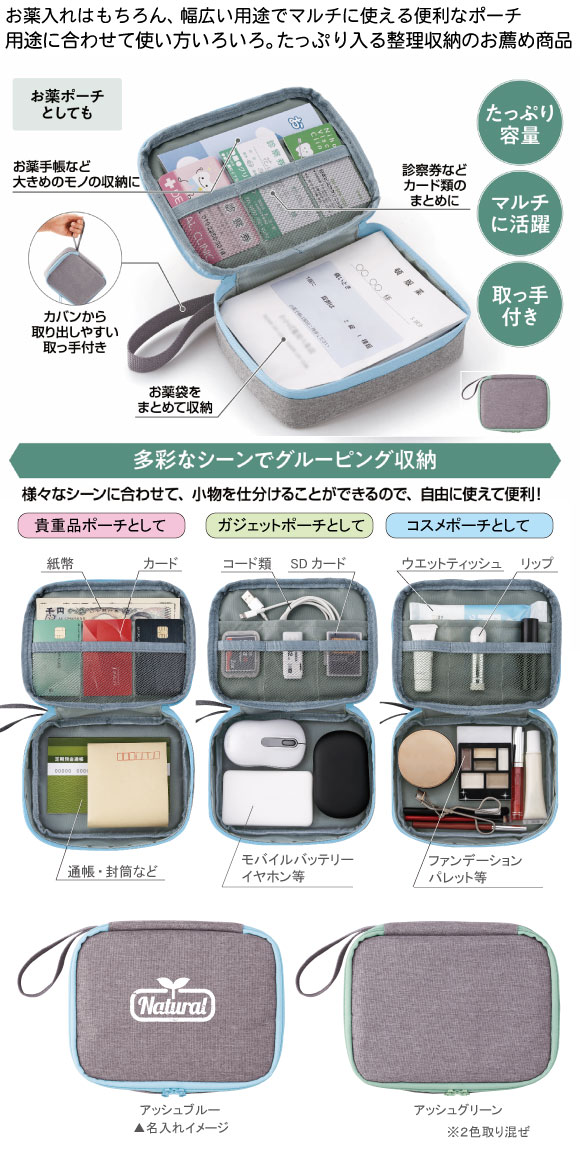 収納王子コジマジック・マルチお薬ポーチはかさばるカードやスマホのコード、化粧道具などコンパクトにスッキリ収納できるマルチポーチ。たっぷり入る整理収納のお薦め商品です。旅行に持って行くコスメポーチや病院に行くときにも使用できるお薬ポーチ。他にも銀行の通帳やクレジットカード入れなど多彩なシーンに合わせて使い方はいろいろ可能です。家庭向き収納の販売促進として記念品やノベルティ、販促品用に企業やお店のロゴやマークなどの名入れをすれば より一層宣伝効果があります。