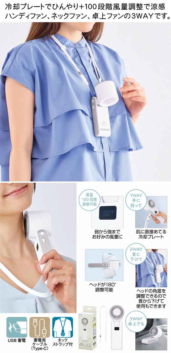 100段階風量調整3WAYペルチェファン(USB充電式)は肌に直接あてる冷却プレートでひんやり+100段階風量調整で涼感。卓上使いはもちろん、ヘッドの角度を調整できるので、首から下げて使用もできます。