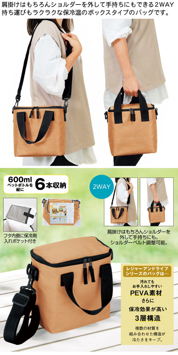 レジャーアンドライフ・保冷温2WAYボックスバッグは持ち運びに便利な斜めがけタイプ。ショルダーベルトが調整可能なので肩掛けはもちろん手持ちにも。汚れてもお手入れしやすいREVA素材を採用。600mlペットボトルが縦に6本入り、保冷効果が高い3層構造でフタ内側に保冷剤入れポケット付きなので長い間、冷たさをキープします。