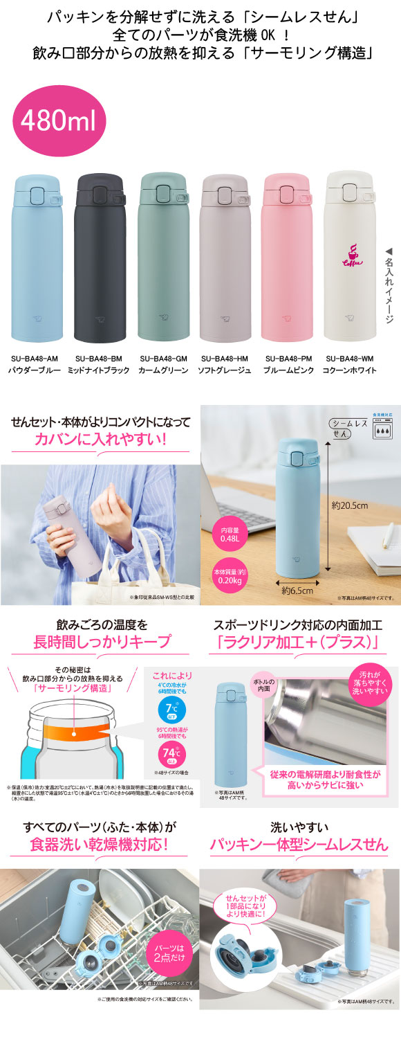 象印 シームレスせん 軽量・ワンタッチステンレスマグ480mlはせんとパッキンをひとつにした「シームレスせん」です。「外して洗うパッキン」が一体化して、ふたのパーツはたった2点に。洗うたびにパッキンを外さなくていいから、お手入れがとっても簡単になりまし。パッキンをなくしたり、つけ忘れて水漏れする心配もなし。食器洗い乾燥機対応になって、さらにお手入れしやすく。ふたも本体もまるごと洗えてラク。片手でラクラク操作!「ワンタッチオープン」ロック解除はスライドを動かして、ボタンを押すだけの使いやすいステンレスボトルです。広口も約4cmと氷も入れやすい。飲み口部分からの放熱を抑える「サーモリング構造」で独自の内びん構造で保温力がさらにアップ!温かい飲み物も冷たい飲み物も、ステンレス真空2重のまほうびんだから飲み物の温度を長時間キープ!内面のフッ素コートは、はっ水性があり水切れもよく、茶しぶやコーヒーの色・ニオイが残りにくい仕様になっています。