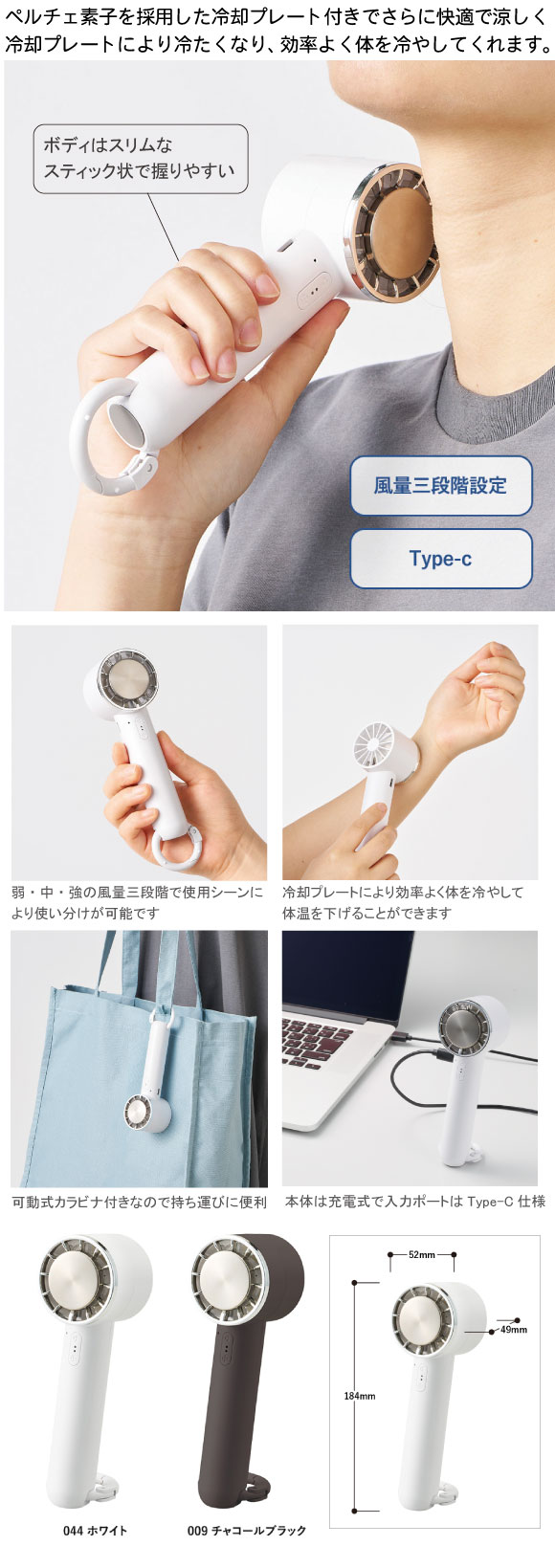 冷却プレートカラビナ USBハンディファンはペルチェ素子を採用した冷却プレート付きでさらに快適で涼しいUSBハンディファンです。ファンを起動させた状態で氷マークを押すと、ファン中央についている冷却プレートが冷たくなり、首などに当てることで効率よく体を冷やして体温を下げることができます。ボディはスティック状で握りやすく、またボディ下部には可動式カラビナ付きなので持ち運びにも便利です。カラビナ底面部分には滑り止めが付いているので、スタンドファンとしてもお使いいただけます。また本体は充電式で、入力ポートはType-C仕様です。弱・中・強の3段階で風量調節ができるため、使用シーンに応じて使い分けることもできます。企業やブランドロゴなどワンポイント名入れをすれば、購入特典や高級ノベルティとしてもぴったりです。