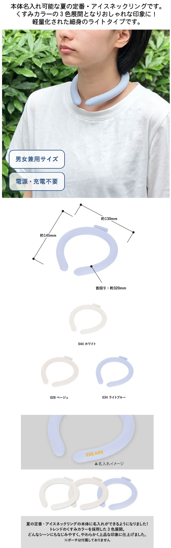 カラーアイスネックリング ライトは本体名入れ可能な夏の定番・アイスネックリングです。くすみカラーの3色展開となりおしゃれな印象に!どなたでも使いやすいレギュラータイプと軽量化された細身のライトタイプの2型展開で、エンド業種の客層により選びやすくなりました。