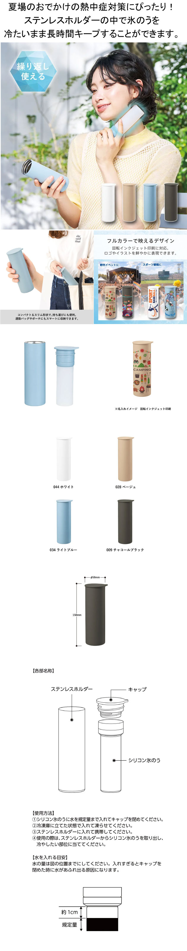 ポータブルシリコン氷のうは夏場のおでかけの熱中症対策にぴったり!持ち歩きにぴったりな氷のうです。ステンレスホルダーの中で氷のうを冷たいまま長時間キープすることができます。スリムな形状でかばんにもすっぽり入るので、外出時に持ち歩いていつでも首元など冷やしていただけます。本体に単色またはフルカラーでぐるりと印刷が可能で野外イベントやスポーツ観戦グッズ、学校の記念品など暑い時期にぴったりなオリジナルグッズとしてご提案いただけます。