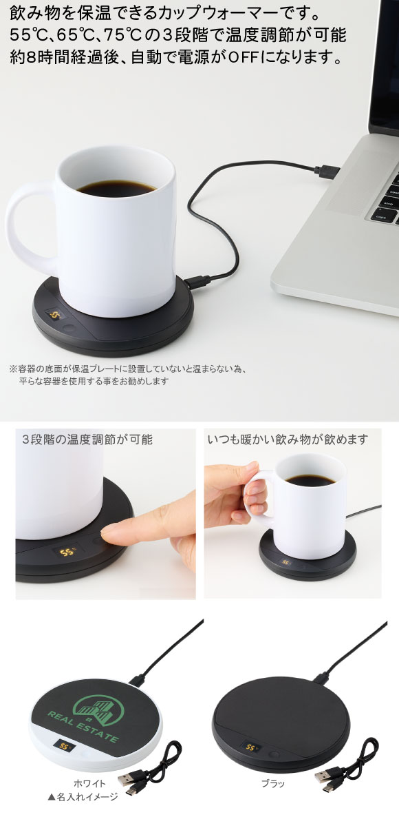 USBカップウォーマー ラウンドは 飲み物を保温できるカップウォーマーです。USB電源に繋いで使用することで、オフィスやご自宅での作業時や休憩中、飲み物がすぐに冷めてしまうのを防いでくれます。55℃・65℃・75℃の3段階で温度調節が可能で、お好みの温度でご使用いただけます。また約8時間経過した場合、自動で電源がOFFになる安全機能付きで安心です。付属のType-Cケーブルは取り外し可能な仕様のためかさばりにくく、持ち運びや収納の際にも便利です。ウォーマー部分には名入れ範囲広く取れ、さらにディスプレイ横にもワンポイントの印刷が可能です。デスクワークの多い企業のグッズや、インテリアメーカーのノベルティなど幅広くご提案いただけます。※容器の底面が保温プレートに設置していないと温まらない為、平らな容器を使用する事をお勧めします