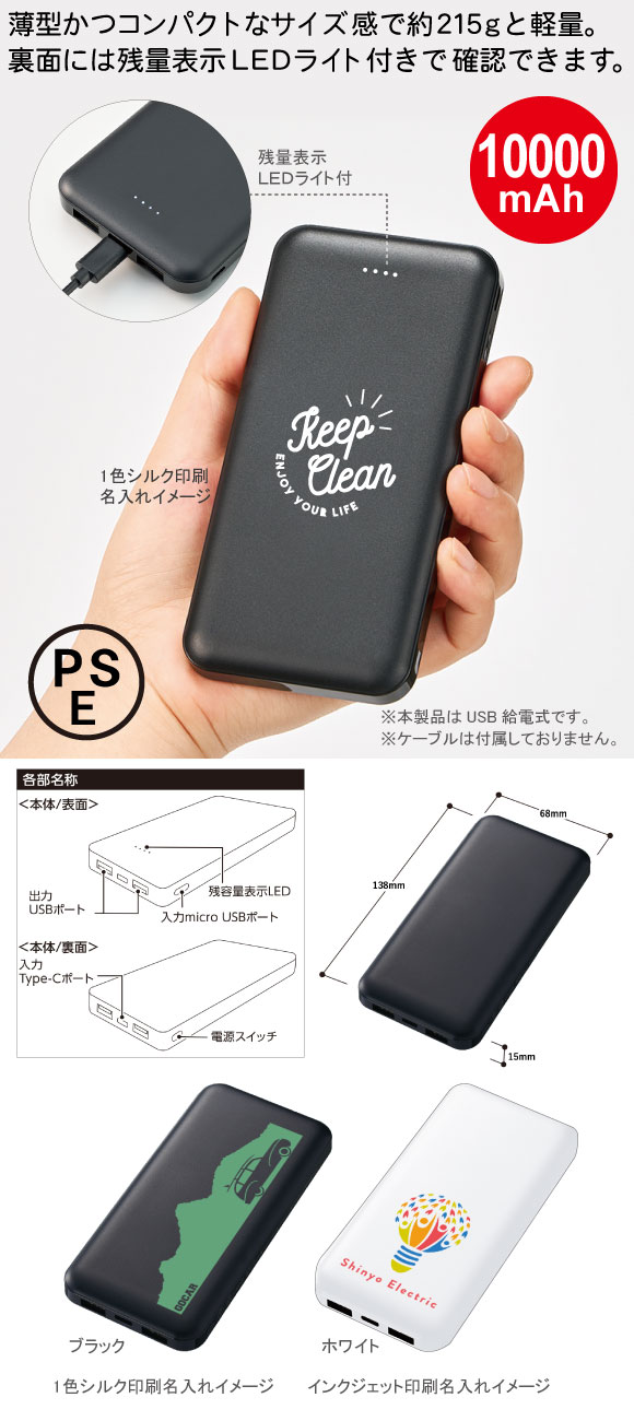10000mAhでご用意しており、用途やご予算にあわせてお選びいただけます。PSEマークは本体側面にあるため、本体表裏に広く印刷範囲を取ることができ企業グッズやイベントノベルティなど様々な案件にご提案いただけます。
